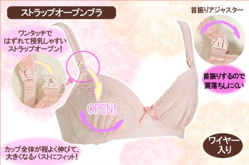 授乳に便利なストラップオープンブラ♪ <産前~授乳期> ワンタッチで外れて授乳しやすいストラップオープンデザイン。 首振りアジャスターは肩落ちしにくい仕様になっています。 カップ全体が程よく伸びて大きくなっていくバストに対応します。 ワイヤー入りでしっかりバストをサポートします。 4段階の1cmピッチの細かなサイズ調節が可能です。 可愛らしいピンク色に刺繍がされたお洒落なデザインです。