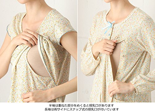 - ●【長袖と半袖、パンツの3点セット授乳口付パジャマ】2枚のトップスと1枚のパンツで何通りも組み合わせができるパジャマセットです。やさしい色合いの花柄を、レースやフリルで甘さのあるガーリーテイストに。長袖トップスは両サイドにスナップ式の授乳口が付いている仕様になっており、半袖トップスは重ねた部分をめくると授乳口があります。パンツは股上深めでお腹をしっかり包み込みます。アジャスターゴムでウエスト調節が可能です。