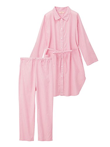 爽やかなストライプ柄と衿付きデザインで、ホームウエアとしても使えるキレイめデザインに。パンツなしでも着られる長め丈&前開きデザインで、産院着にもおすすめです。