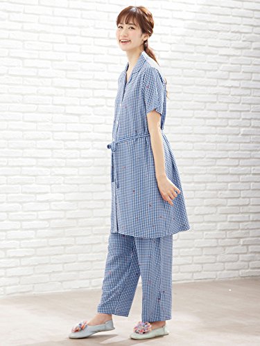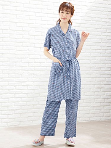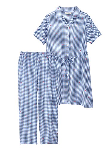 犬印本舗 fairy フェアリー マタニティ パジャマ 授乳しやすい レーヨン チェック & チェリー柄 プリント ナイティ 産前 産後 前開き セット商品 妊婦服 入院 M~L ブルー