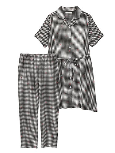 犬印本舗 fairy フェアリー マタニティ パジャマ 授乳しやすい レーヨン チェック & チェリー柄 プリント ナイティ 産前 産後 前開き セット商品 妊婦服 入院 M~L ブラック
