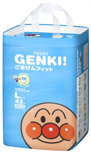 「ネピアGENKI(ゲンキ)ごきげんフィットパンツL42枚(新・3Dフィット吸収体)パンツ式」は、どんな体型にもごきげんにフィットするLサイズパンツ式紙おむつです。モレに強く、おしりもすっきり。おなか周りサイズが大きい子にもやさしくフィット。ゴム跡がつきにくく、おなかを締め付けません。新・3Dフィット吸収体が体に沿って、立体的にフィットするから、モレに強い。おしり側もすっきり。カラフルなパターンがかわいい全12柄。1パックに2柄入りです。(C)やなせたかし/フレーベル館・TMS・NTV