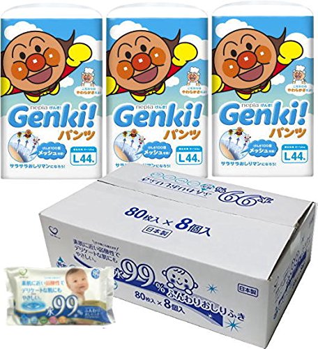 ネピアGENKIパンツLサイズ44枚x3パック+ライフ堂 水99%おしりふき80枚x8パックのセット販売です。