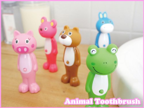 かわいい笑顔のアニマルキャラクターのフィギュアが、おへそのボタンをポチッと押すとハブラシに早変わり。