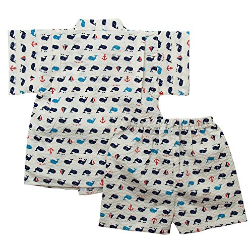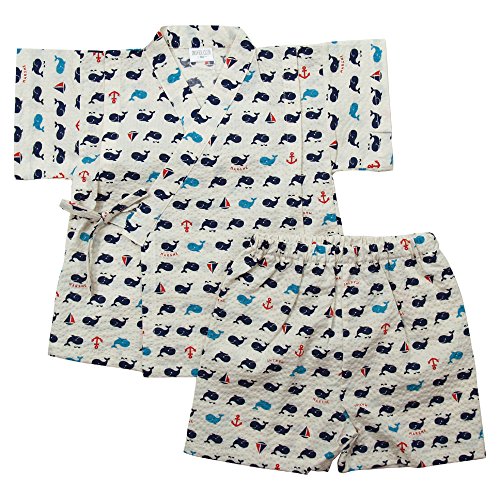 《盛夏 甚平》(ジンベイ) 日本製ベビー男児 リップル生地くじら総柄甚平スーツ 90cm/オフシロ NO.OG-75547
