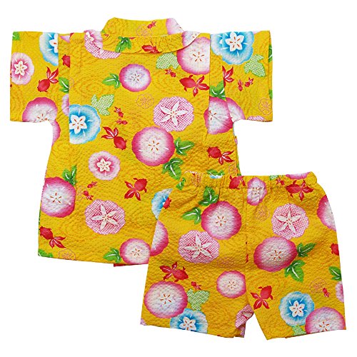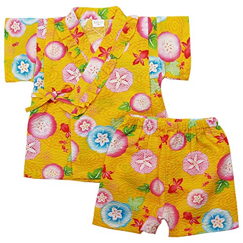 《盛夏 甚平》(ジンベイ) 日本製ベビー女児 リップル生地アサガオ&金魚柄衿フリル甚平スーツ 95cm/イエロー NO.OG-75554