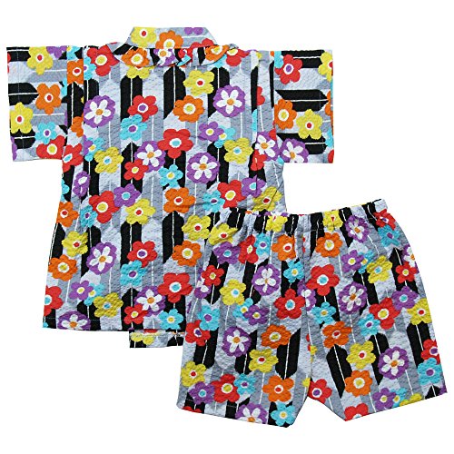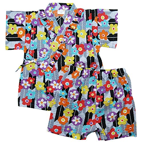 《盛夏 甚平》(ジンベイ) 日本製ベビー女児 リップル生地花総柄衿フリル甚平スーツ 80cm /ブラック NO.OG-75558