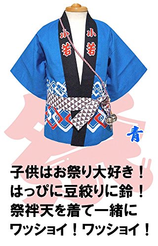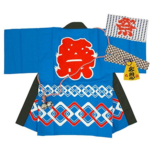 祭り はんてん 日本製 ベビー キッズ はっぴ 豆絞り手拭い 鈴 5点セット 青 大(5-7才)