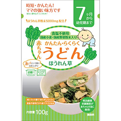 ●【商品説明】●「赤ちゃんうどん ほうれん草 (7ヶ月から幼児期まで) 100g」は、明治創業の老舗麺屋が赤ちゃんの為に開発したうどんです。●食塩を使用せず、国産小麦と野菜粉末だけで作りました。●(小麦粉100g中に5gのほうれん草粉末が練り込まれています。●)食塩不使用・無着色なので、茹で汁を捨てずにお鍋一つで調理できます。●お好みのダシや具材と一緒に煮込んでください。●短いカット麺で切らずにラクラク。●電子レンジでも調理ができるのでカンタンです。●7ヶ月頃から幼児期まで、幅広くご利用頂けます。●本品は食品衛生法に基づく乳児用食品の規格基準が適用される食品です。●賞味期限等の表記について西暦年/月の順番でパッケージに記載。●【お問い合わせ先】●製造者田靡製麺株式会社 白浜工場TEL:079-245-0425受付時間 9:00-17:00 土日祝を除く●【原産国】●日本●【原材料名・栄養成分等】●名称:うどん●原材料名:小麦粉、ほうれん草粉末●栄養成分表示:100gあたりエネルギー:342kcal、たんぱく質:10.6g、脂質:0.7g、炭水化物:7...