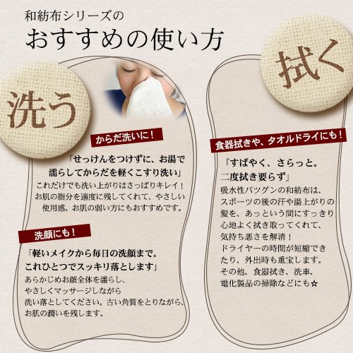 吸水性バツグンの和紡布は、スポーツの後の汗や湯上がりの髪を、あっという間にすっきり心地よく拭き取ってくれて、気持ち悪さを解消!ドライヤーの時間が短縮できたり、外出時も重宝します。その他、洗車、ふきん、電化製品の掃除などにも☆ - 人の手で織り上げた、自然と人にやさしい布。