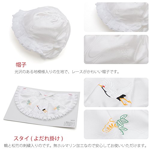 白色でよだれかけには縁起物の鶴や松が刺繍されており、フードにはレースがあしらわれています。