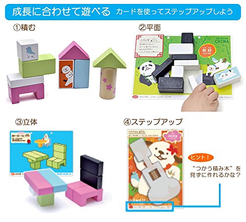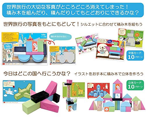- 「カードつきパズル積み木 たのしい世界旅行」が登場! パズルのようにシルエットに合わせて作る「形合わせ」と立体絵を観察して組む「形作り」の 2通りのカードがついた積み木のセットです。 付属のカードは「世界旅行」がテーマで絵本テイストとなっています。 各国の観光地や名物が描かれていますので、ストーリー性がありお子さまの好奇心や探究心をかきたてます。 「カードつきパズル積み木 たのしい世界旅行」は対象年齢が1.5歳からですので、成長に合わせてながく遊んでいただけます。