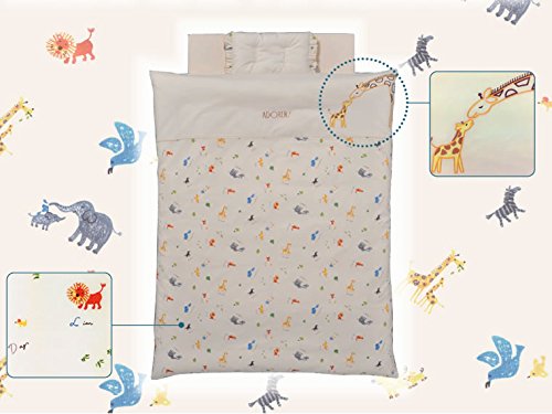 - (1)掛けカバー(102㎝×128㎝) (2)掛けふとんヌード(95㎝×120㎝) (3)掛けふとんヌード(95㎝×120㎝) (4)マクラ(33㎝×19㎝) (5)敷きふとん(70㎝×120㎝) (6)敷きふとん用シーツ(70㎝×120㎝) (7)防水シーツ(70㎝×120㎝) (8)キルトパット(70㎝×120㎝)