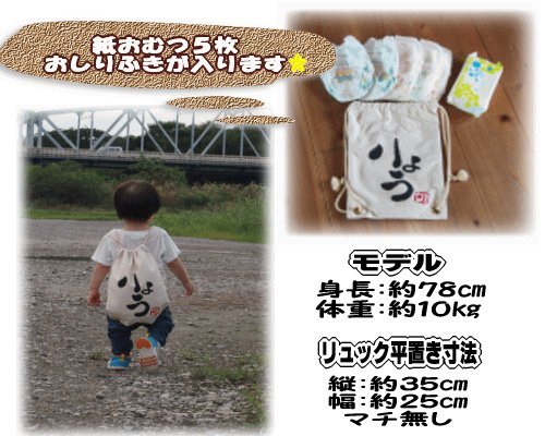●リュックの生地は『岡山県倉敷産帆布生地、コットン100%』を使用。 リュックはおむつ5枚、おしりふきが入る大きさです。