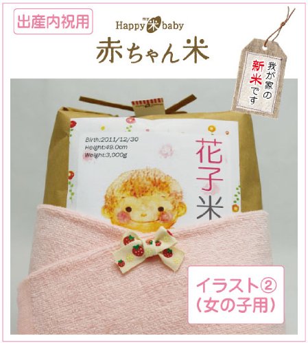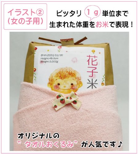 【送料無料】(*沖縄・離島は別途加算いたします) 『出産内祝に贈る赤ちゃん体重米”HAPPY米BABY(赤ちゃん米)”』新潟産コシヒカリ100%のお米を赤ちゃんの「出生時と同じ重さ」に詰めてかわいいギフトをお作りします。ひとりひとりオリジナルで作成するラベルには、赤ちゃんの「お名前」「誕生日」「身長」「体重」「メッセージ」をお入れします。かわいいイラスト付きのラベルを貼った米袋はとってもかわいらしく、受け取った方も思わず「にっこり」してしまう幸せ運ぶ贈り物です。さらにこのお米袋をタオルでCuteに「おくるみ」します。まるで「本当に赤ちゃんを抱っこしているみたい♪」と好評です。「毎日食べるお米はどなたにも喜ばれました!」や「かわいくって食べるのがもったいない」などうれしい感想をいただいております(^^♪せっかくの内祝だから記念に残るこんな贈り物はいかがでしょうか?【こちらの商品は「新潟産コシヒカリ(出生体重:3501-3750g)の「イラスト:女の子2」バージョンです。他の体重、ラベルデザイン、お米の種類をお求めの場合は、商品名下の店名「美味爛漫どっとコム」をクリックして、商品一覧の中からお選びください。】