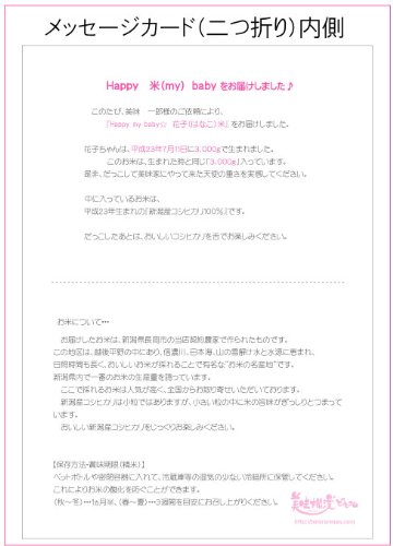 - 中身のお米は当店契約農家が育てた新潟産コシヒカリ。生産者直接仕入れだから安心の品質。どなたに贈っても必ずお喜びいただけます!ラッピングやのしもかわいらしくてGOOD!