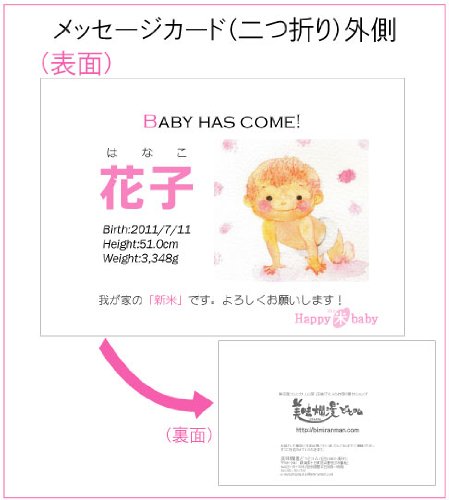 - ラベルには赤ちゃんのお名前、誕生日、身長、体重をお入れします。かわいいイラスト付きでとても愛らしく仕上がります。