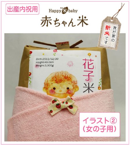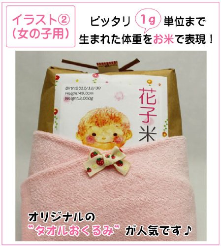 【送料無料】(*沖縄・離島は別途加算いたします) 『出産内祝に贈る赤ちゃん体重米”HAPPY米BABY(赤ちゃん米)”』新潟産コシヒカリ100%のお米を赤ちゃんの「出生時と同じ重さ」に詰めてかわいいギフトをお作りします。ひとりひとりオリジナルで作成するラベルには、赤ちゃんの「お名前」「誕生日」「身長」「体重」「メッセージ」をお入れします。かわいいイラスト付きのラベルを貼った米袋はとってもかわいらしく、受け取った方も思わず「にっこり」してしまう幸せ運ぶ贈り物です。さらにこのお米袋をタオルでCuteに「おくるみ」します。まるで「本当に赤ちゃんを抱っこしているみたい♪」と好評です。「毎日食べるお米はどなたにも喜ばれました!」や「かわいくって食べるのがもったいない」などうれしい感想をいただいております(^^♪せっかくの内祝だから記念に残るこんな贈り物はいかがでしょうか?【こちらの商品は「新潟産コシヒカリ(出生体重:3751-4000g)の「イラスト:女の子2」バージョンです。他の体重、ラベルデザイン、お米の種類をお求めの場合は、商品名下の店名「美味爛漫どっとコム」をクリックして、商品一覧の中からお選びください。】