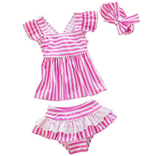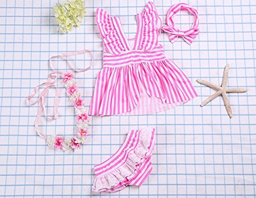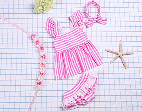 子供 女の子 水着 セパレート ストライプ ボーダー 3点セット フリル レース ターバン付き 人気 (S:4~5歳(95~105cm), ピンク)
