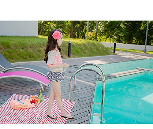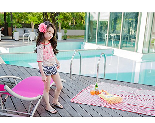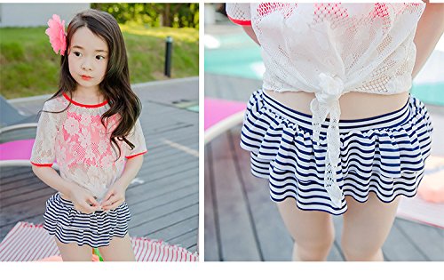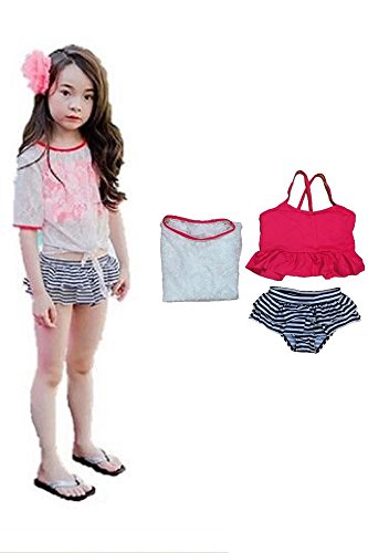 (美来Kids) 子供 女の子 レース ラッシュガード付き セパレート 水着 フリル ピンク ボーダー ビキニ 3点セット ガールズ キッズ (L(130))