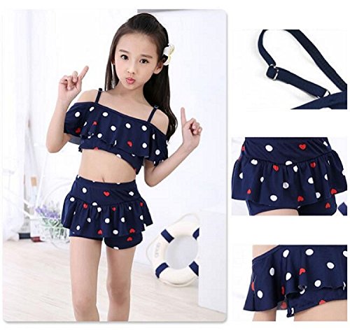 (美来Kids) 子供 女の子 セパレート 水着 フリル ドット ハート 肩紐調節 オフショルダー ビキニ 2点セット (L(115-130), ネイビー)