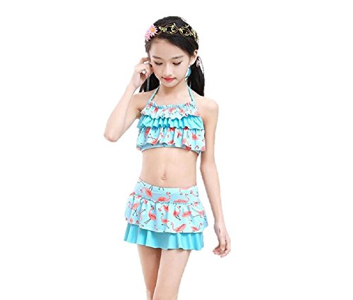 (美来Kids) 子供 女の子 セパレート 水着 フリル ドット ハート 肩紐調節 オフショルダー ビキニ 2点セット (L(115-130), フラミンゴ・ブルー)
