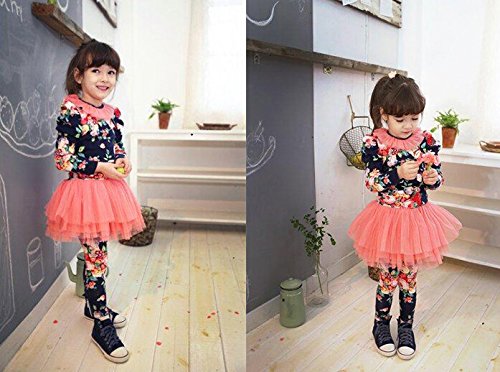 キッズ 女の子 花柄 セットアップ 長袖 Tシャツ チュールスカート付き レギンス スカッツ 上下セット (140, 紺色)