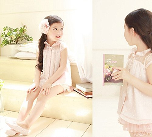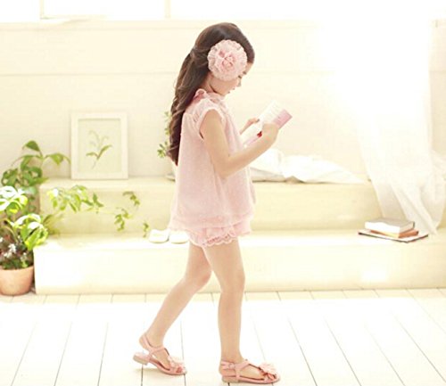 子供 女の子 セットアップ シフォン レース ブラウス 半袖 半ズボン リボン ラブリー ガーリー キュート かぼちゃパンツ (130, ピンク)