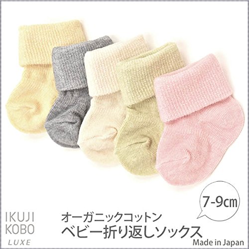 育児工房のオーガニックコットン ベビー折り返しソックスです。 足首から踵の上下にゴムが入っていて、やさしくフィットして脱げにくくなっています。 植物から抽出した天然染料を使って、糸にする前のわたの状態で染める洛陽染めで染色しました。 天然染料のやわらかい色合いが、赤ちゃんの足元をかわいく引き立ててくれます。 洛陽染めの技法により従来の天然染めより色褪せしにくいのが特徴です。 サイズ : 7-9cm ※綿衣料品の特性上、個体差がある旨ご了承ください。 素材 : オーガニックコットン88% ポリエステル10% その他2% カラー : アイボリー・ピンク・グレー・イエロー・グリーン 原産国 : 日本
