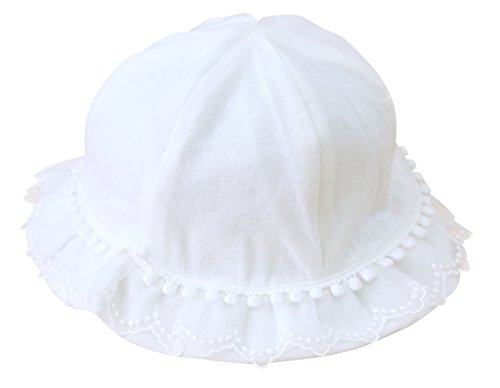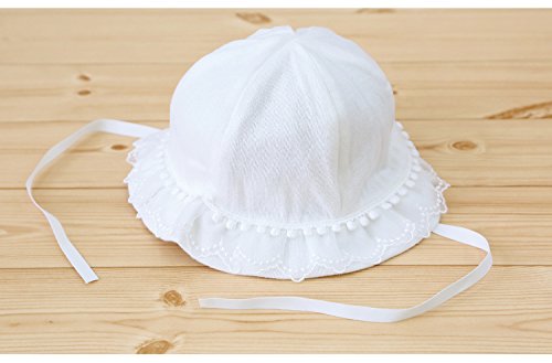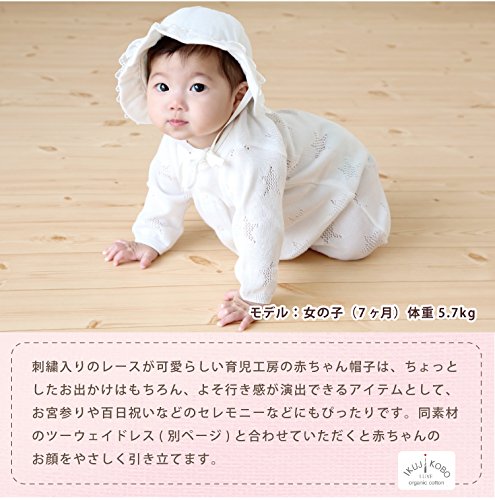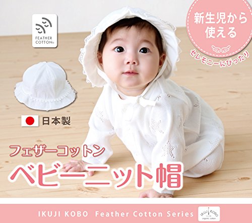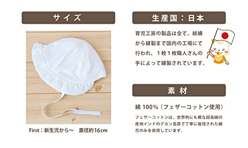 - フェザーコットンを使用した、刺繍入りのレースが可愛らしい育児工房の赤ちゃん帽子です。