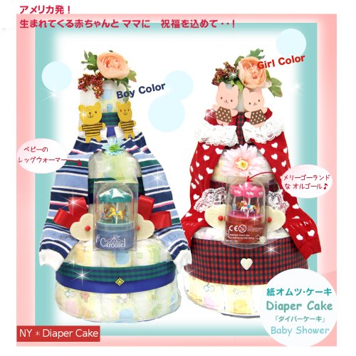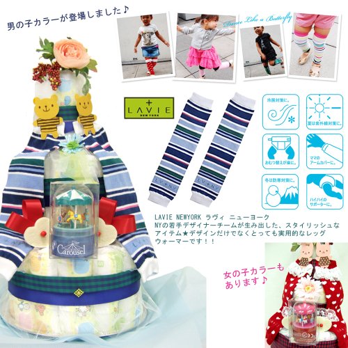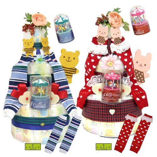 オルゴール&レッグウォーマー付 『ラブ・タワー』3段おむつケーキ (男の子:ブルー、女の子:赤いハート)