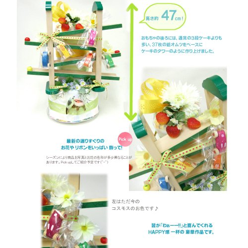 - 赤ちゃんから大人まで楽しめる木製玩具付きオムツケーキです。