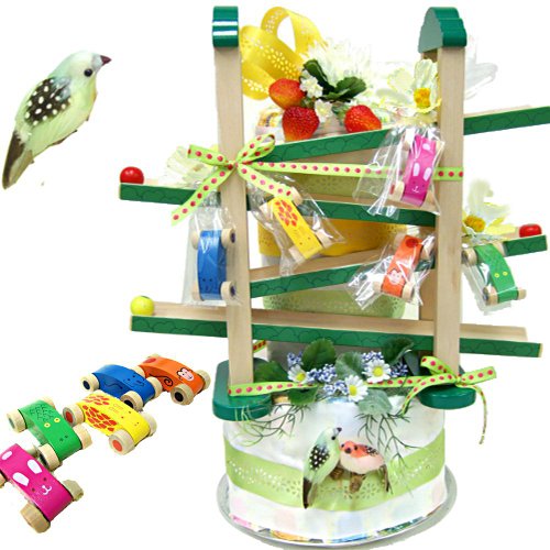【木のおもちゃスロープ★3段オムツケーキ『森の贈り物』】赤ちゃんに安心な木製オモチャ付きおむつケーキ ■豪華さ楽しさにもこだわったBest1ギフト