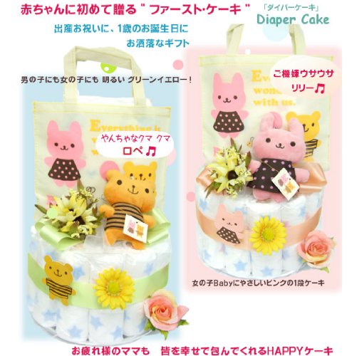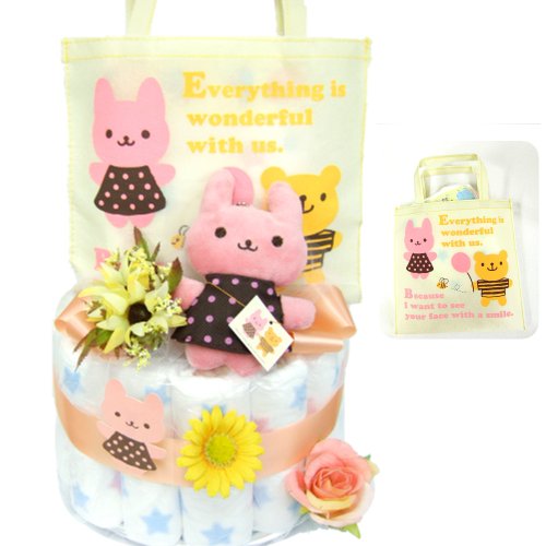 ピンクのうさぎ【リリー】出産祝い♪赤ちゃんにうさうさの1段おむつケーキ。ウサギのぬいぐるみとお散歩袋付き L