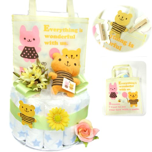 赤ちゃんにやんちゃな【ロペ】のオムツケーキ♪クマクマの1段おむつケーキ くまのぬいぐるみとお散歩袋付き L