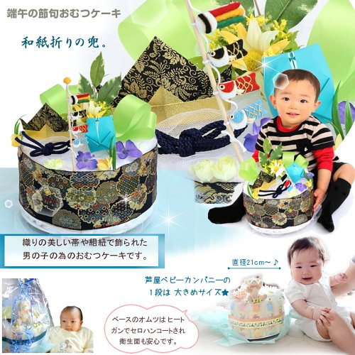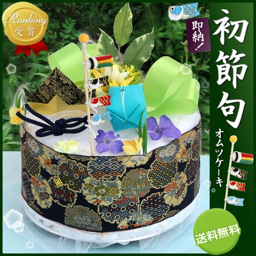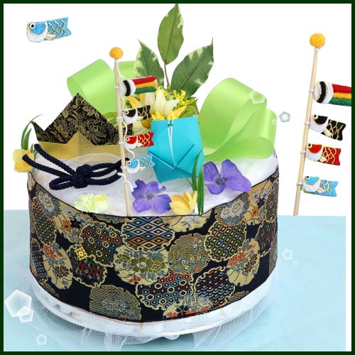 [端午の節句一段オムツケーキ]出産祝い,初節句に。和紙折り兜とちりめん細工の鯉のぼりを飾った和調おむつケーキ L