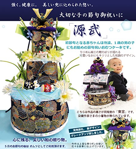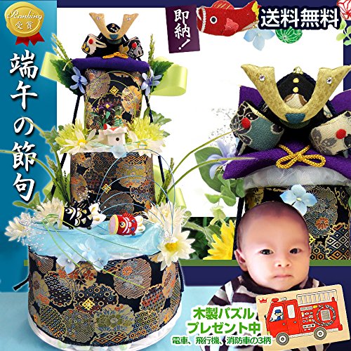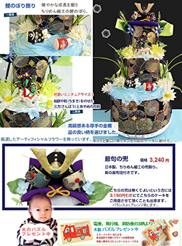 端午の節句限定品おむつケーキ『源武』3段型。ちりめん細工の兜と鯉のぼり,お節句祝い,初節句に[乗り物柄 木製パズルプレゼント] S