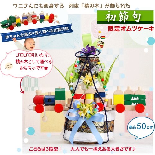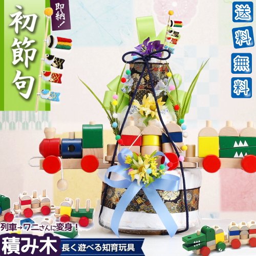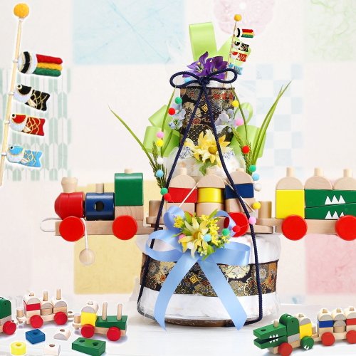 【列車になる積み木付き】豪華3段オムツケーキ 男の子誕生初節句に。ミニ鯉のぼりを飾った和風おむつケーキ S