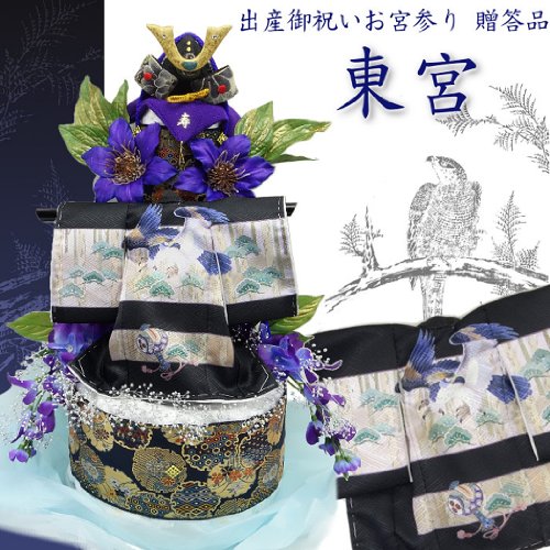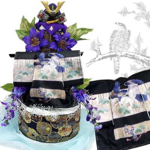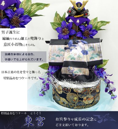 男の子の出産お祝い.お宮参り。最高級 【東宮】日本製ちりめん細工の兜とミニ着物を飾った3段おむつケーキ L