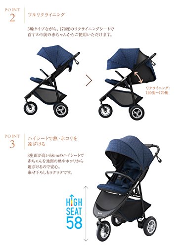・3輪タイプながら、170度のリクライニングシートで首すわり前の赤ちゃんからご使用いただけます。また、座面が高い58cmのハイシートで赤ちゃんを地面の熱やホコリから遠ざけるので安心。乗せ下ろしもラクラクです。