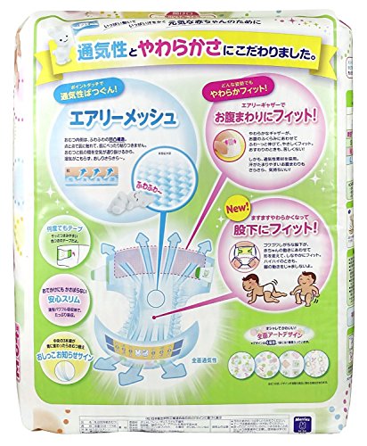 通気性とやわらかさにこだわりました。 【メリーズさらさらエアスルー テープの商品詳細】 ●肌にあたる部分に、ふわふわ凸凹構造の新表面材「エアリーメッシュ」を採用。 ●肌とおむつの間を空気が通り抜け、通気性がなんと3倍(荷重モデル試験による当社従来品比)!湿気がこもらずおしりさらさら。 ●肌にペタッとくっつかない!ねんねやおすわりでおむつに圧力がかかっても、点でふれるから、肌にあたる面積がたったの半分。おしっこを吸収した面が肌にくっつきません。 ●ゆるゆるウンチをナイスキャッチ。たくさんの凹部分でうんちをせきとめ広げにくくします。デリケートなおしりを刺激から守ります。 ●9~14kg