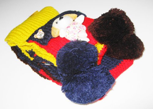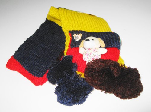 超可愛いキッズマフラー 子熊ちゃん付き カラフル編み 冬用 防寒 ニット (紺*茶)