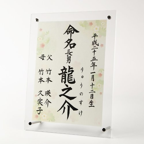 大切なお子様ご誕生の記念品として、命名書(簡易額入り)はいかがでしょうか? 透明感が美しいアクリルフレームにA4サイズの命名書を包み込みました♪ ご両親から大切なお子様へのプレゼントに、ご出産のお祝いに、おじいちゃん・おばあちゃんに感謝を込めたギフトに、様々なシーンでご利用ください。 毛筆師範が心を込めて代書いたします(代書無料)。お七夜にはもちろんのこと、ご出産のギフトにも最適なメモリアルグッズです! ※ご注文確定後、当店より代書内容確認メールを送信させていただきます。 ※代書内容確認後、3営業日以内の発送となります。 【筆耕者紹介】 平成7年:文化書道学会 六段合格 平成8年:文化書道学会 師範免許取得 その他書道検定、書初め競技大会など、多数受賞