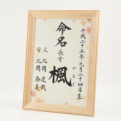 [萌舟] 毛筆代書付き命名書 もみじ A4サイズ 日本製ヒノキ額入り