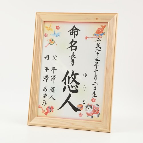 [萌舟] 毛筆代書付き命名書 男女兼用 A4サイズ 日本製ヒノキ額入り