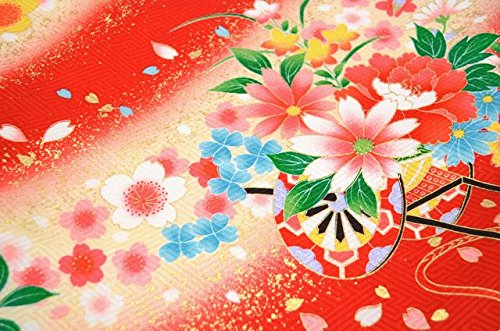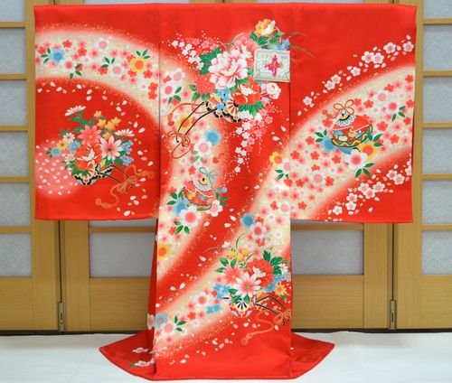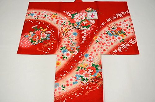 - 赤に綺麗なベージュぼかし地の華やかなお着物です。全体に散りばめられた色とりどりの花柄が、とても豪華です。綺麗な流れ柄の女の子らしい可愛い品になります。地紋の入った上質な絹生地を使用しています。豪華な花柄と綺麗なぼかし地のお宮参り着物【初着 産着】になります。