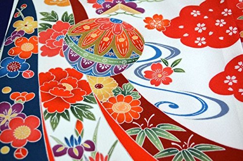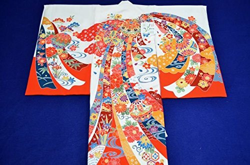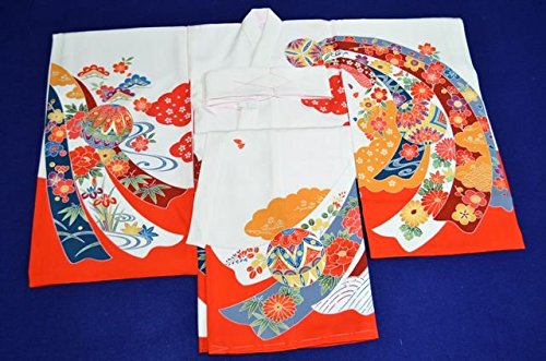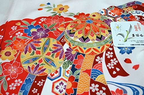 - 白地に京紅型柄のとても華やかなお着物です。手鞠や色とりどりの花びらがとても品が良いです。全体に描かれております熨斗束がとても豪華です。厚手のどっしりした生地を使用しており、たいへん高級感があります。京紅型の珍しい柄のお宮参り着物【初着 産着】になります。