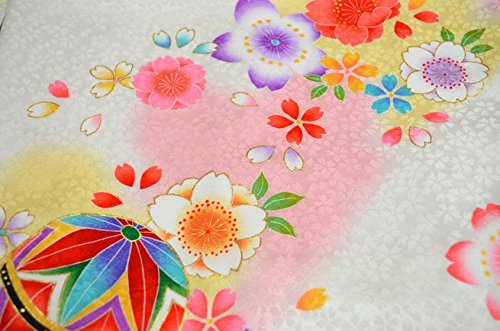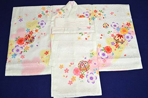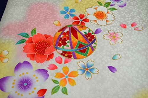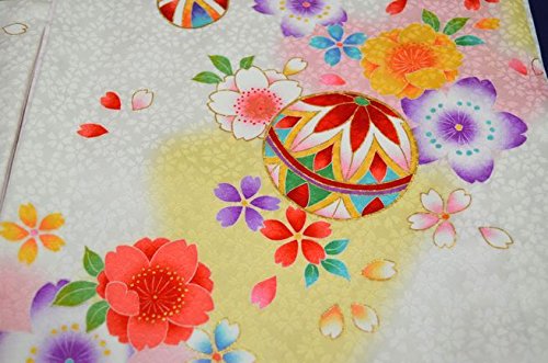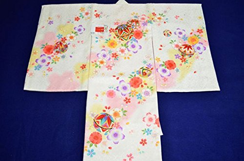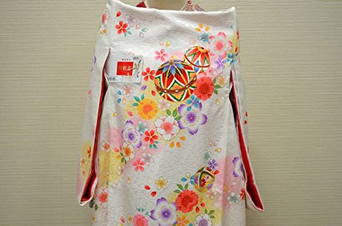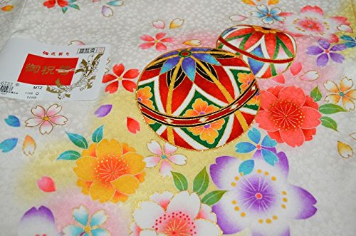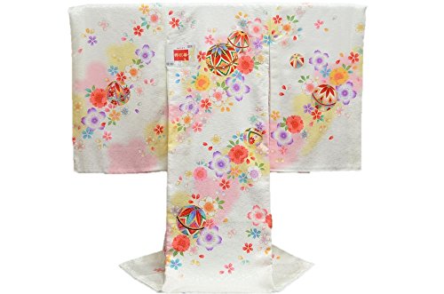 - 白地に華やかな花と手鞠が全体に描かれた可愛いお着物です。背の金糸加工された手鞠柄が、豪華で高級感があります。全体に描かれた色とりどりの花柄がとても綺麗です。桜の地紋が入った厚手の生地を使用しています。女の子らしい華やかなお宮参り着物【初着 産着】になります。