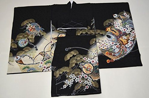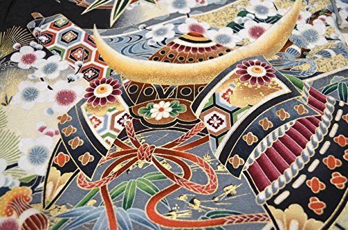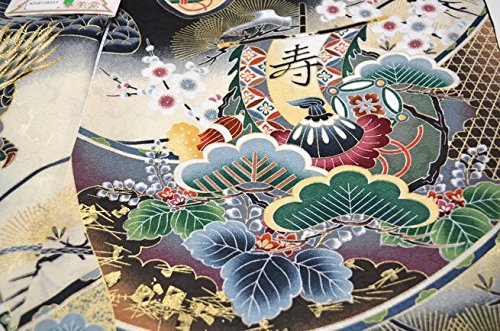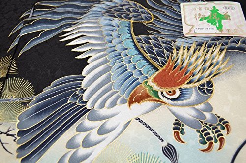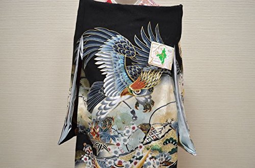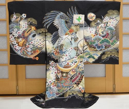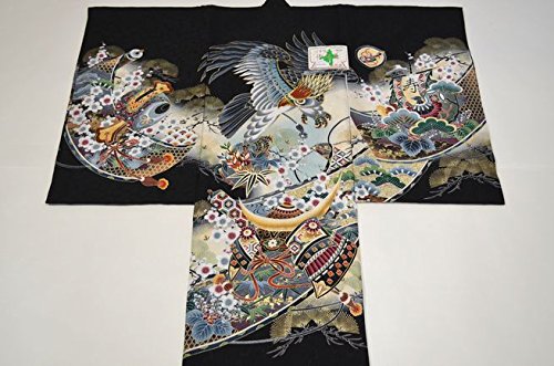 - 黒地にベージュのぼかし地。全体に古典柄が描かれた豪華なお着物です。刺繍を使用した背の鷹柄が、とても高級感があります。金箔を使用した兜柄や松柄が綺麗です。地紋のある厚手のしっかりした絹生地を使用しております。綺麗な刺繍鷹柄と豪華な古典柄のお宮参り着物【初着 産着】になります。