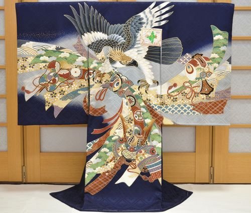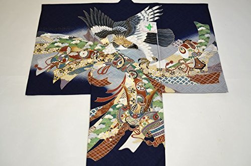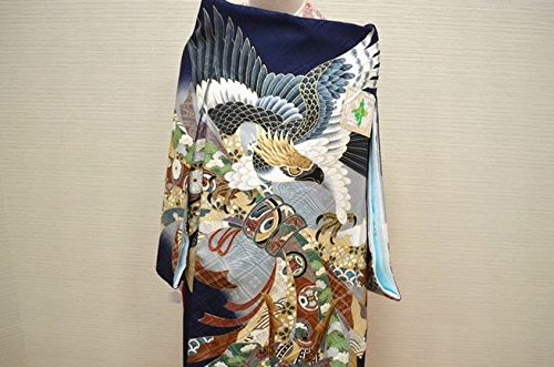 - 紺地に、綺麗なベージュぼかし地。豪華な熨斗束柄が描かれたお着物です。金箔柄の背の鷹が、とても高級感があります。金箔柄が多く描かれており、上品に仕上がっております。地紋の入った上質な絹生地を使用しております。豪華な鷹と熨斗束柄のお宮参り着物【初着 産着】になります。